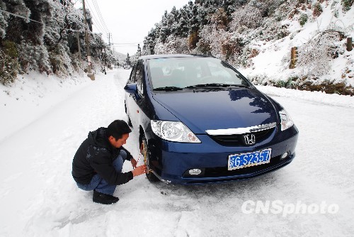 11月18日,在江西庐山北山公路上,一名驾驶员在给汽车安装防滑链。中新社发 胡国林 摄