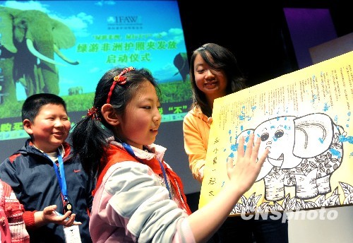 11月20日,小学生代表在他们自己创作的“与小象一起长大”的画上按手印。当天是国际儿童日,国际爱护动物基金会邀请北京市部分小学生和工作人员一起发放绿游非洲护照夹,倡导绿色出游,抵制濒危动物制品,保护生态环境。中新社发 远舟 摄