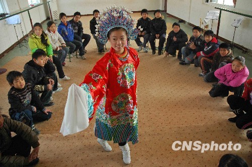 11月20日,河南淮阳县赵玲文化艺术学校的小豫剧迷们在表演豫剧,庆祝“国际儿童日”。中新社发 杨正华 摄