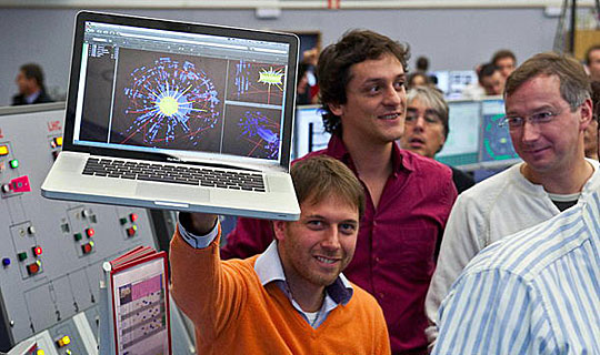 11月20日,在瑞士日内瓦附近的大型强子对撞机控制中心,欧洲核子研究中心的科学家庆祝欧洲大型强子对撞机恢复运行。