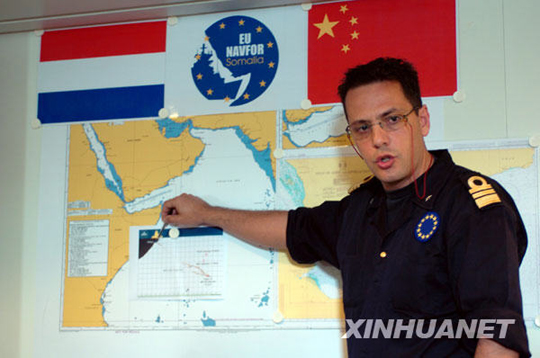 11月22日,在亚丁湾海域,一名荷兰“埃沃特森”舰海军作战军官向中国海军第三批护航编队指挥员王志国少将介绍欧盟465编队在亚丁湾的反海盗兵力部署。