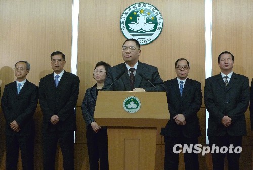 十一月二十四日下午,澳门特区第三届政府各主要官员及检察长在第三任行政长官崔世安带领下,在特区政府总部会见传媒。中新社发 毕永光 摄
