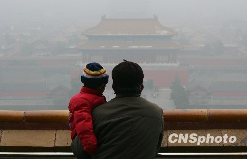 一场大雾将北京城逐渐笼罩起来。中新社发 刘震 摄