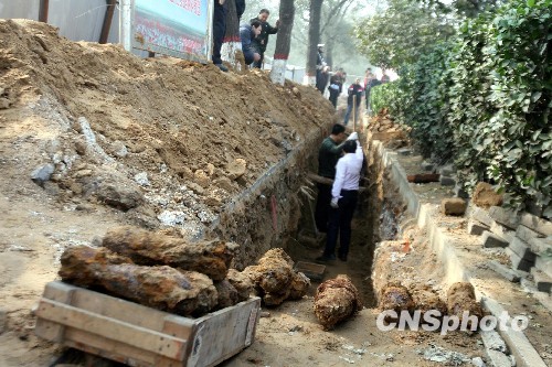 11月25日上午,郑州市正兴街与福寿街交叉口西北角三角公园内,郑州警方挖出数层粘连在一起的老炮弹弹,截止记者发稿时,首批挖掘出迫击炮弹72枚、手榴弹13枚,另有炸药包和雷管等爆炸物还在继续挖掘之中,一些炮弹上标有德国制造的字样。发现炸弹的位置,属郑州市二七商圈和火车站商圈交汇处,其南约200米,是郑州市二马路长途汽车站。