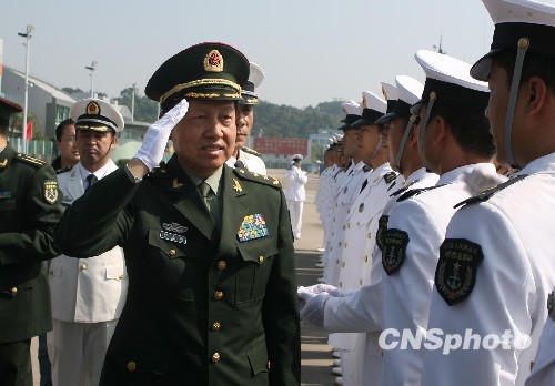十一月二十五日,人民解放军驻港部队政委刘良凯中将,出席在昂船洲基地举行的“驻军第十二次建制单位轮换海军部队防务交接仪式”,热烈欢送、欢迎驻港轮换官兵。中新社发 郑祚声 摄