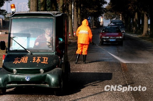东湖环卫管理处派出职工,用高压水枪来清洗路面的“油垢”,以防汽车打滑。中新社发 周国强 摄