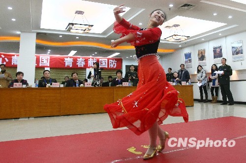 11月28日,按照征兵工作安排,北京市海淀区60多名体检合格的应征女青年迎来了“面试关”。来自解放军艺术学院、解放军军乐团、北京电影学院等多部门组成的面试考察组,将从形象气质、语言表达、才艺专长的方面对应征女青年进行评定。考评采取现场打分方式,确保公平公开,力争把最优秀的青年输送到部队。图为应征者在进行才艺展示。中新社发 富田 摄