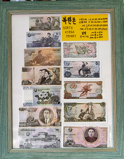 12月1日,韩国板门店一侧的韩国商店展示朝鲜新货币。据朝鲜官员当日对外透露,朝鲜于11月30日更换了货币,这是该国十七年来首次更换货币。新旧货币兑换率为100比1。