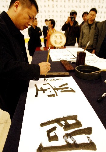 12月2日,“问墨——秦国仁书法展”在北京中国美术馆对外开展。展出来自内蒙古的青年书法家秦国仁50件精品力作。作品书体以楷书和行书为主,丰富的形制全面展示了其深厚的艺术功力和高超的艺术水平,表现出一位青年艺术家对传统文化艺术的深入继承与大胆探索。图为内蒙古的青年书法家秦国仁在现场展示书法。中新社发 钱兴强 摄