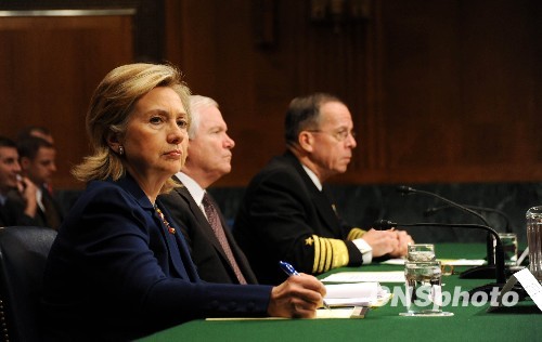 美国国务卿希拉里、国防部长盖茨(中)、美国参谋长联席会议主席马伦2日上午共同出席参议院有关新阿富汗战略的听证会。中新社发 李静 摄