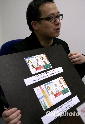 。图为十二月三日易达华在记者会上介绍他设计的“香港2009东亚运动会”纪念封连小全张。中新社发 张勤 摄