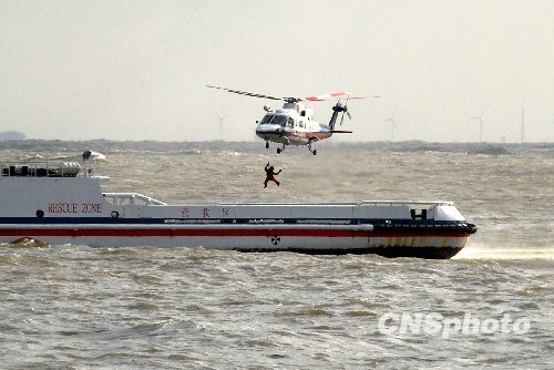 一架参加救援的直升飞机将遇险船员运送到救援船上。 中新社发 海云飞 摄