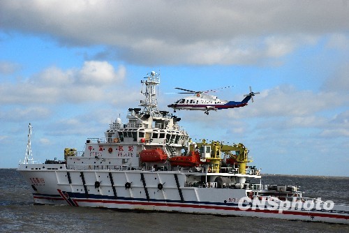 一架参加救援的直升飞机从救援船上飞过。 中新社发 海云飞 摄