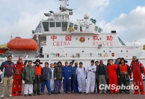 获救的外籍船员在救助船前与救助队员合影。 中新社发 海云飞 摄