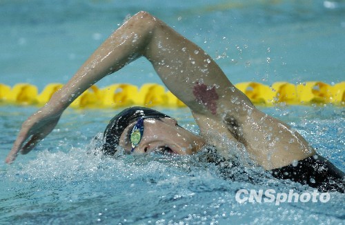 12月6日晚,第五届东亚运动会男子1500米自由泳决赛在香港九龙公园游泳池进行,中国选手孙杨一枝独秀,一路领先以14分58秒35夺冠,并打破张琳在2005年澳门东亚运动会创造上的赛会纪录。中新社发 盛佳鹏 摄
