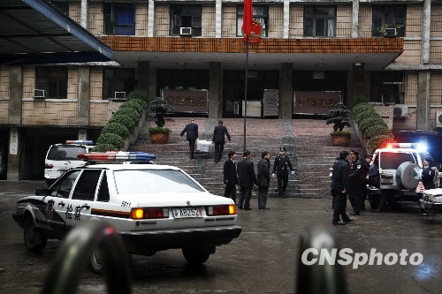 12月8日,重庆第五中级人法院民,检察官进入审判大厅,两大箱卷宗吸引了人们的眼球。 中新社发 潘钰琳 摄