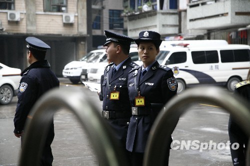 12月8日,重庆第五中级人民法院,王天伦等23人涉黑案当日开审,图为法警在执勤。 中新社发 潘钰琳 摄