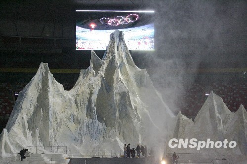 12月11日,工人们在北京国家体育场内搭建巨大的雪山雕塑,造雪机正喷出大量雪花。首届鸟巢欢乐冰雪季将于12月19日在国家体育场亮相,承办过奥运会的鸟巢将成为北京市区内最大的雪上运动中心。中新社发 苏丹 摄
