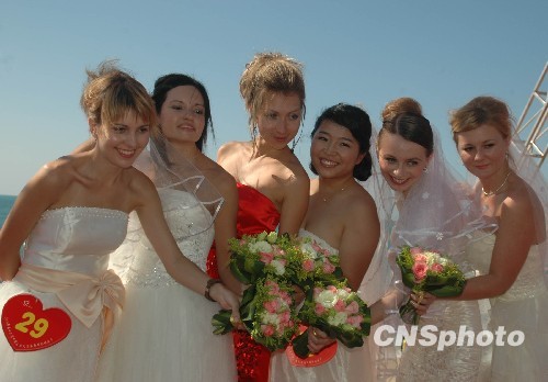 十二月十二日,第十三届天涯海角国际婚庆节在海南三亚天涯海角游览区的沙滩上举行,包括十对俄罗斯新人在内的百对中外新婚伉俪和纪念婚伉俪共享天涯海角的浪漫婚庆时光。 图为六位俄罗斯新娘子留下幸福的合影。中新社发 尹海明 摄