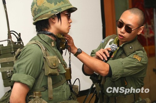 12月12日,北京一架军事俱乐部迎来了一年一度的军装秀活动,军迷会员们穿着各国军服盛装出席。活动已成为了该俱乐部军迷交流、学习军事知识的盛大PARTY。图为穿着越战期间美军服装的军迷正在讲解身上装备的用途。中新社发 富田 摄