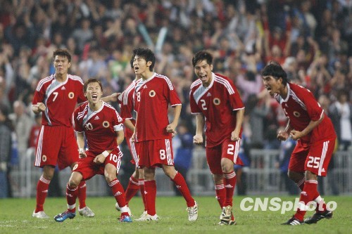 12月12日,2009东亚运动会继续在香港进行激烈争夺。在香港大球场举行的男足决赛中,中国香港队与日本队点球一决胜负,最终香港5-3击败日本队夺冠。 图为中国香港队队员庆祝胜利。中新社发 盛佳鹏 摄