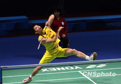 十二月十三日,香港东亚运羽毛球男子单打决赛开战,中国选手林丹0:2负于韩国选手崔镐振无缘冠军。中新社发 张勤 摄