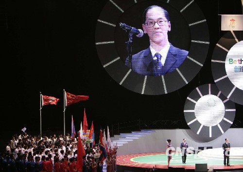第五届东亚运动会筹备委员会会长曾德成致辞。中新社发 张勤 摄