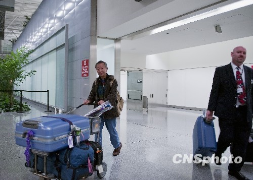 经过近十几个小时长途飞行后,高锟精神十足,并自己亲手推行李车,无需搀扶。中新社发 陈钢 摄