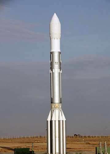 图为哈萨克斯坦境内的拜科努尔航天发射场,一枚“质子-M”运载火箭等待发射。