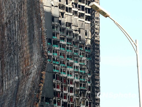 12月16日,记者看到位于北京东三环的中央电视台新址的失火配楼,南墙中间几层房间出现了绿色施工围挡,增加围挡的房间墙体与过火前相比明显变白。