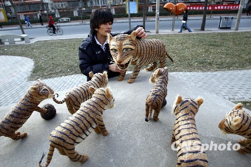 北京一位时尚发型设计师正在展示他的头发丝创意“大小福虎”贺岁虎年。中新社发 郑雄增 摄