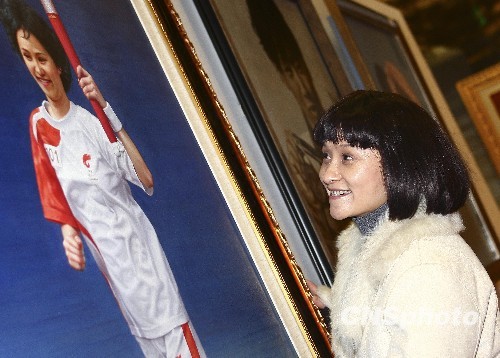 图为奥运冠军、跳水女皇高敏在展览现场观看自己的油画。中新社发 杜洋 摄
