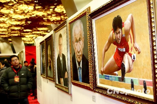 “祖国为你骄傲——中国百年体育明星风采油画大展”在北京鸟巢举行。中新社发 杜洋 摄