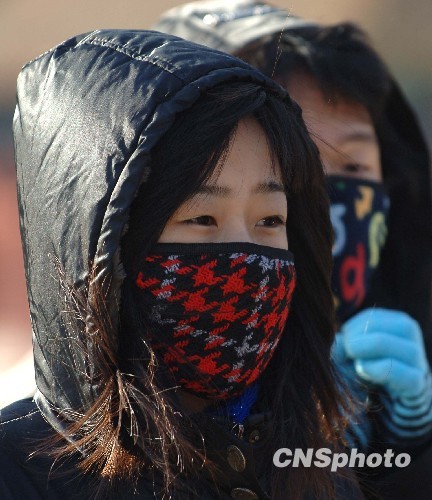 当日在北京故宫紫禁城冒严寒旅游的外地游客,为防寒保暖各显神通。中新社发 邹宪 摄
