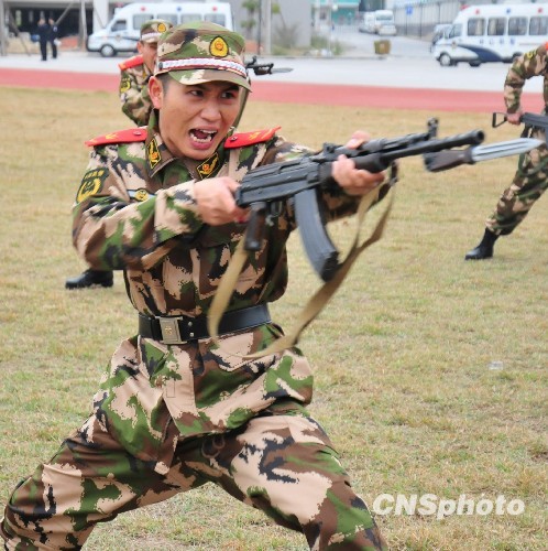 中山边防支队勤务中队官兵正在练习刺杀操。中新社发 李松林 摄