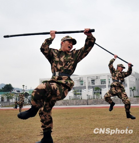 中山边防支队勤务中队官兵正在练习应急棍术。中新社发 李松林 摄