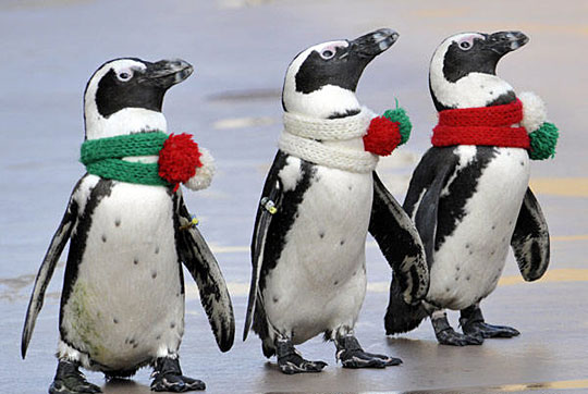 几只裹着圣诞围巾的企鹅在训练员的带领下进行表演。