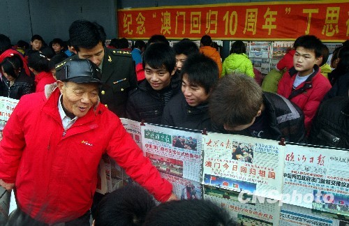 丁思德(左一)老人在郯城县未来中学为师生讲解当年发表澳门回归新闻的报纸。中新社发 房德华 摄