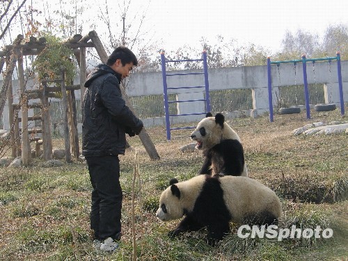 十二月十八日,陕西省珍稀野生动物抢救饲养研究中心里,二00八年八月人工繁育的两只大熊猫在嬉戏。当日,中国第四个大熊猫繁育基地,陕西秦岭大熊猫繁育基地在位于秦岭西部北麓的陕西楼观台开工奠基,占地总面积两百八十七点四公顷,是一个专门针对秦岭亚种大熊猫而建设的饲养、繁育、科研基地。