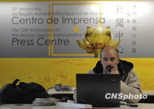 12月18日,澳门友谊大马路澳门回归十周年新闻中心内一名葡萄牙记者正在工作,新闻中心于12月17日启用,相关庆典活动的讯号、数据将传回新闻中心供各类媒体使用。