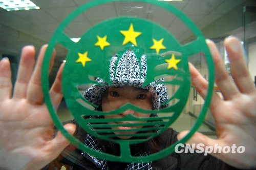澳门籍大学生黄珊在宿舍窗户上张贴剪纸区徽,庆祝澳门回归十周年。中新社发 陈中秋 摄