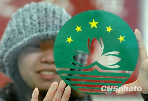 澳门籍大学生黄珊在宿舍窗户上张贴剪纸区徽,庆祝澳门回归十周年。中新社发 陈中秋 摄