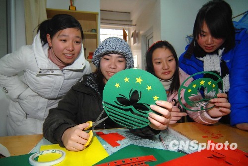 澳门籍大学生黄珊(左二)和同学一起制作剪纸区徽,庆祝澳门回归十周年。中新社发 陈中秋 摄