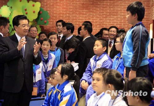 胡锦涛参观澳门科学馆,并与澳门学生亲切交流。中新社发 张勤 摄