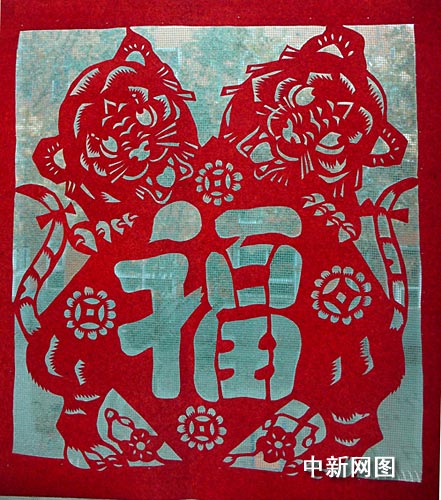 山西民间艺人李传源的剪纸作品“双虎送福”。冯文芳 摄