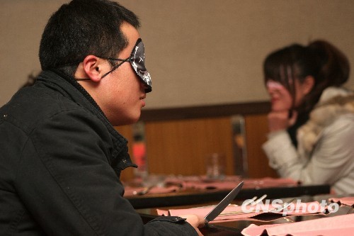 蒙眼派对不见也钟情。中新社发 孙新明 摄
