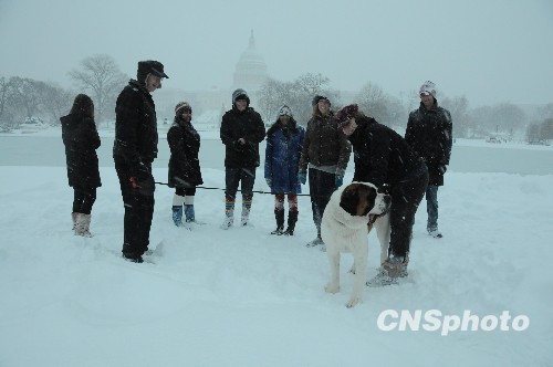 图为当日几名游客在华盛顿国会山附近雪中遛狗。中新社发 吴庆才 摄
