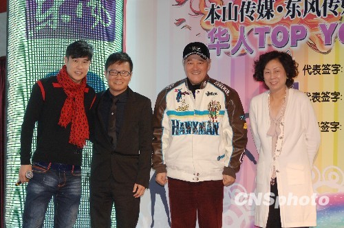 赵本山与东风传媒董事长葛福鸿、华纳音乐大中华区总裁陈泽杉以及小沈阳共同出席了发布会。中新社发 李学仕 摄