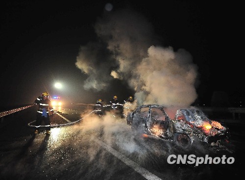 扬州特勤消防战士正在对失火的轿车进行扑救。中新社发 王卓 摄