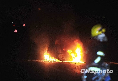 扬州特勤消防战士正在对失火的轿车进行扑救。中新社发 王卓 摄